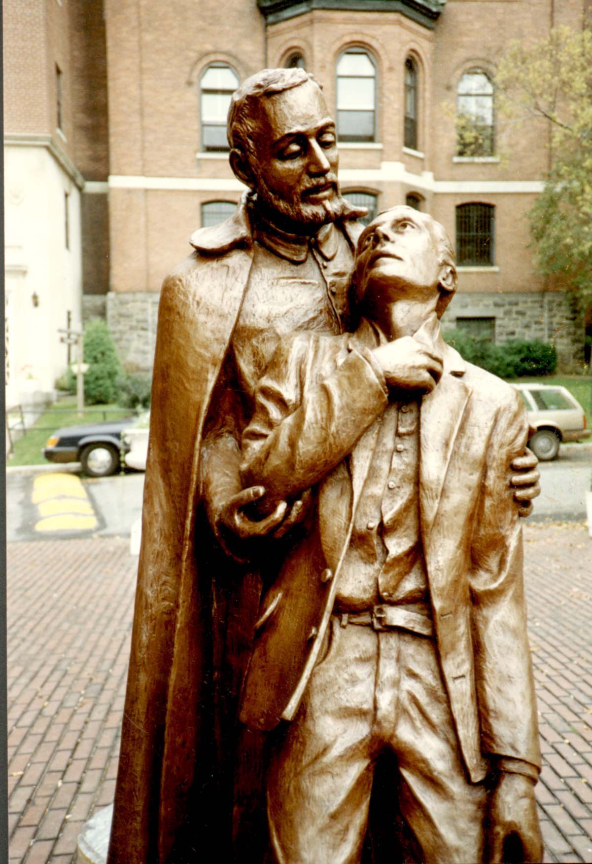 Commercial photo, bronze statue, Vincent de Paul, standing, cassock, cape, supporting young man; work of Sr. Margaret Beaudette; may be copyrighted; in Chapel of the Immaculate Conception, College of Mount Saint Vincent, Riverdale, NY