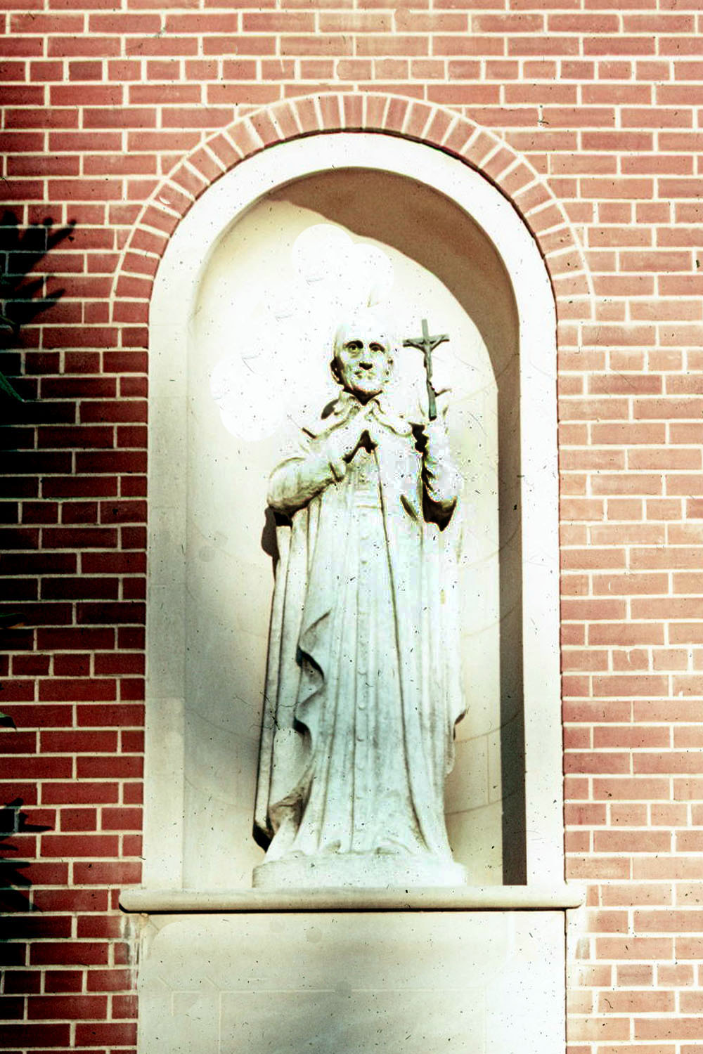 Statue (now removed), Vincent de Paul, standing, cassock, mantle, skullcap, holding crucifix; gesture of preaching; original at former Vincentian house of studies (renamed Nugent Hall), Harewood Road, The Catholic University of America, now