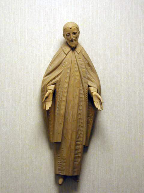 Carved wood, wall mounted; Vincent de Paul, standing, cassock, cape, skullcap, arms extended in greeting; based on originals in Paris; original in Mater Dei Provincialate, Evansville, IN