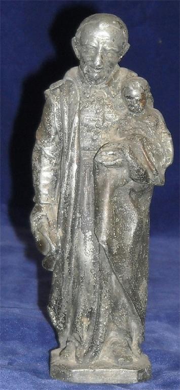 Silvered metal statuette, Vincent de Paul, standing, cassock, cincture, mantle, skullcap, holding hat in right hand; with child on his left arm; location of original unknown; internet image