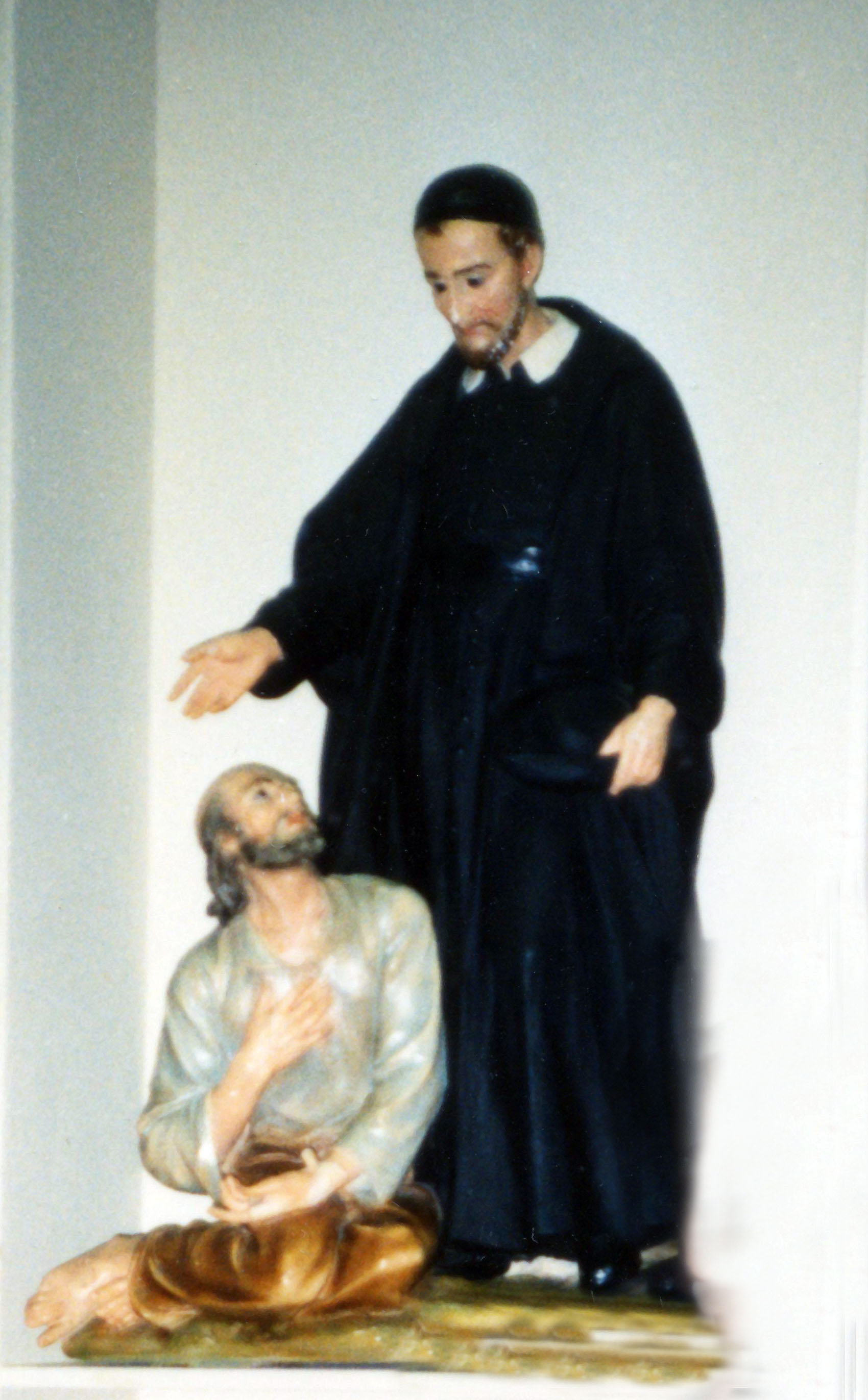 Vincent de Paul, standing, cassock, cincture, mantle, skullcap, holding hat in left hand, young face; with poor man crouching at his feet; formerly in New Orleans, present location unknown