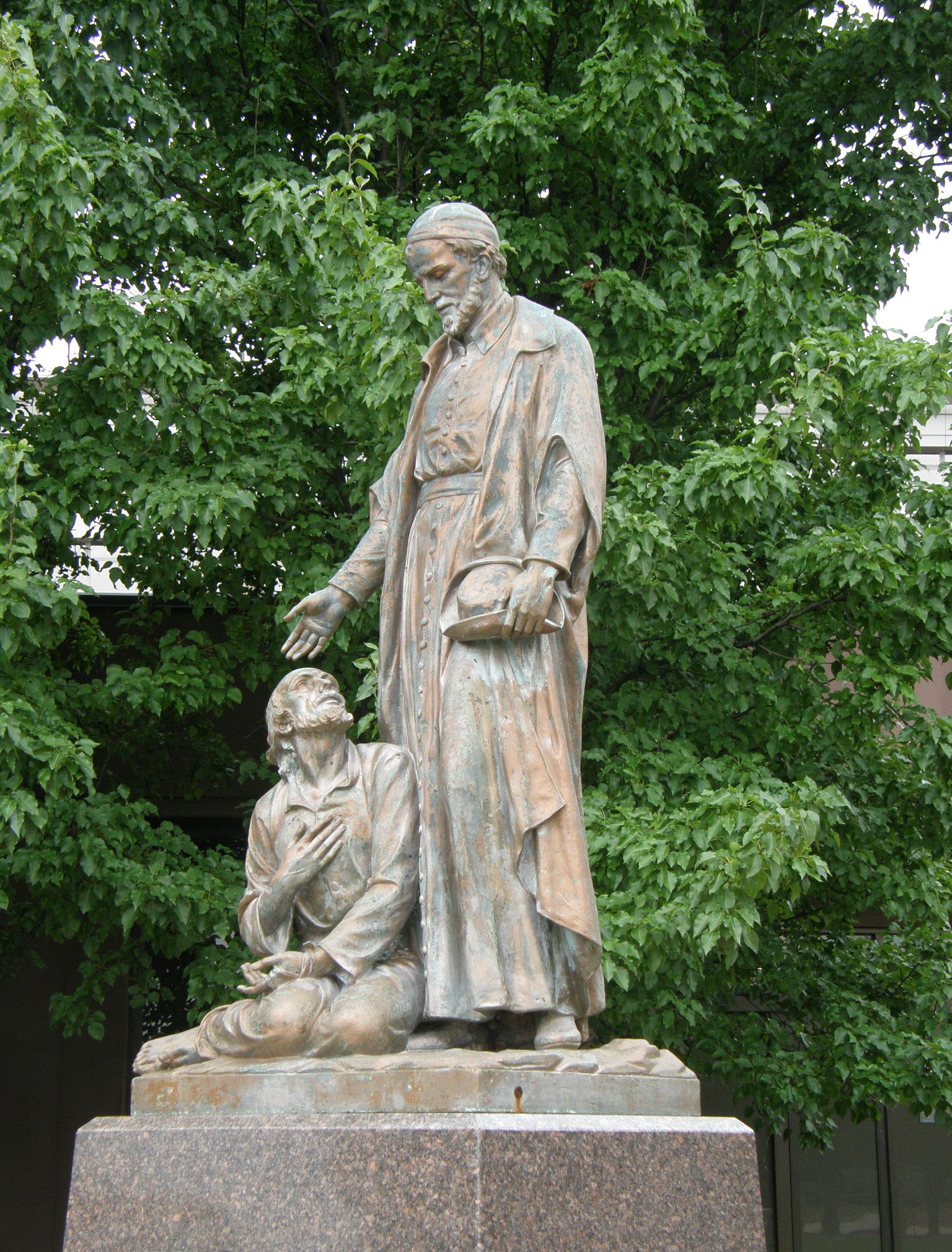 Bronze, on granite base; Vincent de Paul, standing, cassock, cincture, mantle, skullcap, holding hat; gestores toward poor man at his feet; original at St. Vincent Hospital, Indianapolis