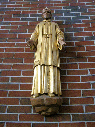 Gilded wood statue, Vincent de Paul, standing, cassock, surplice, stole, skullcap, square-toed shoes; in Auburn, Alabama; based on Paris and Berceau models
