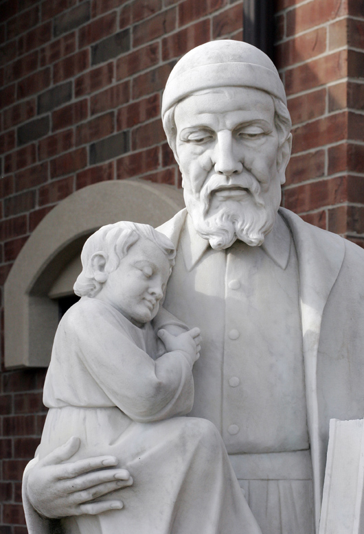 Vincent de Paul, standing, cassock, cincture, mantle, skullcap; divided beard; holding cook, child; courtesy of Fr. Gene Plaisted, OSC