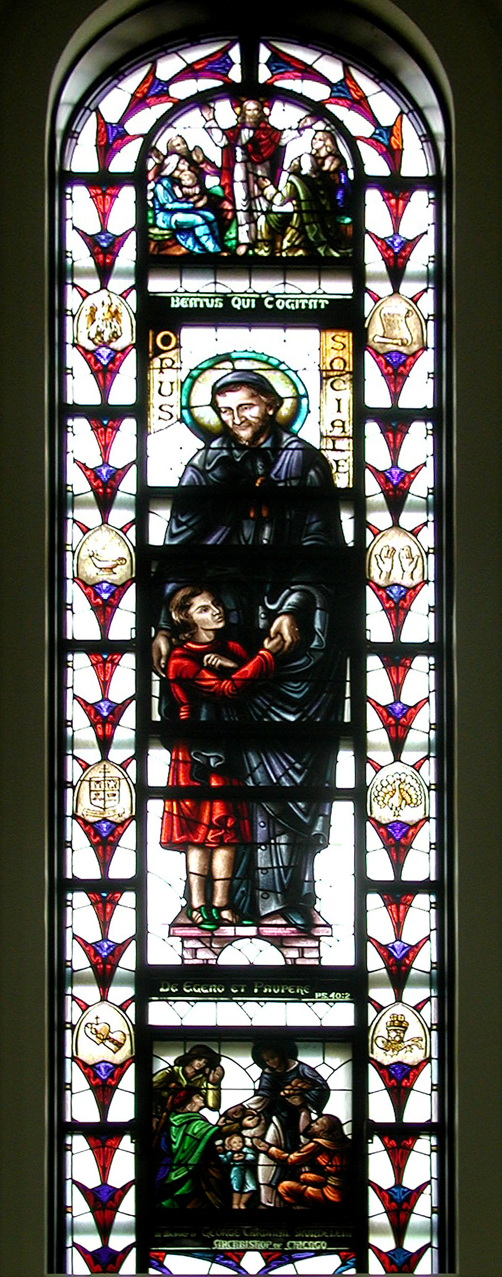 Vincent de Paul, patron of social works, helping girl; distributing food below. Latin texts, Ps 41:1. Original in chapel, Loyola University, Chicago