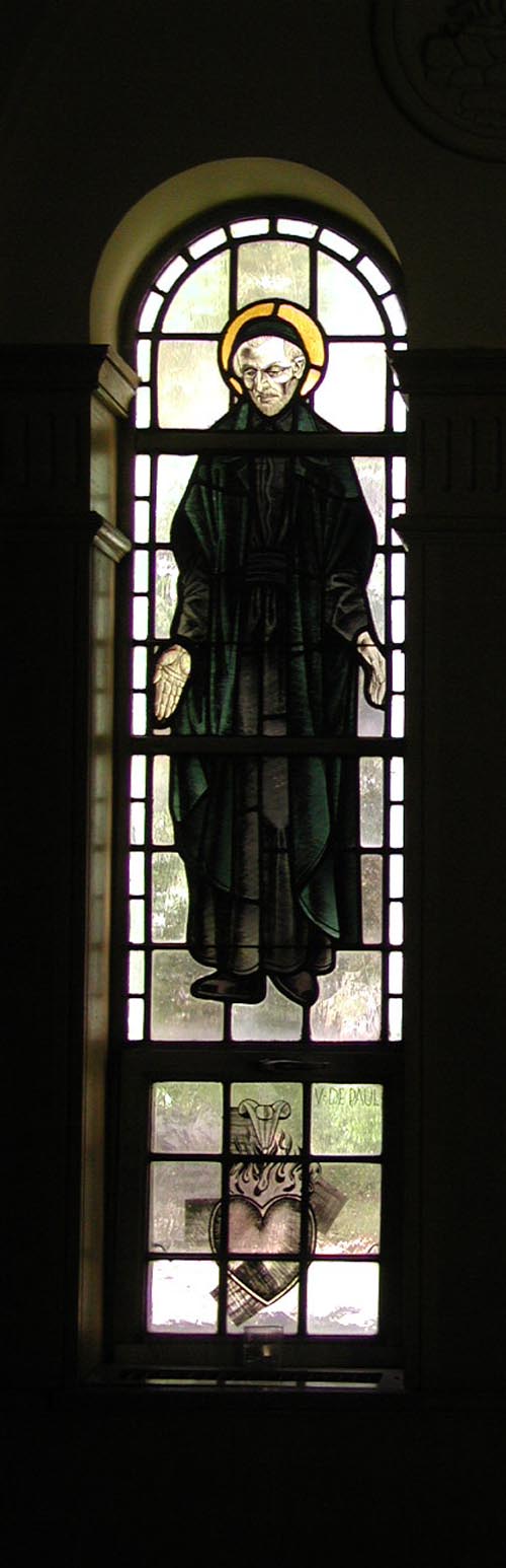 Vincent de Paul, gesture of welcome; heart of charity below. Original in former convent, Holy Trinity parish, Dallas