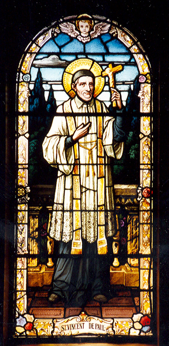 Vincent de Paul pointing to preacher's crucifix. Original in former novitiate chapel, Germantown, Philadelphia