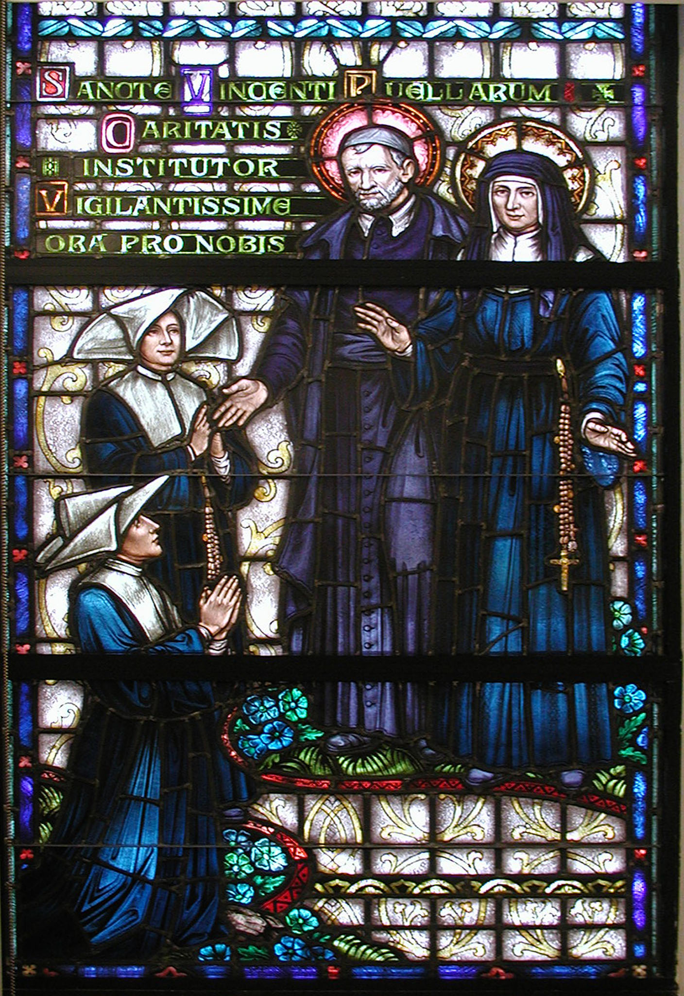 VdP with Louise de Marillac, two Daughters of Charity. Latin text from litany: "SV, watchful founder of the Daughters of Charity..." Original in chapel, St. John's University, Jamaica, NY