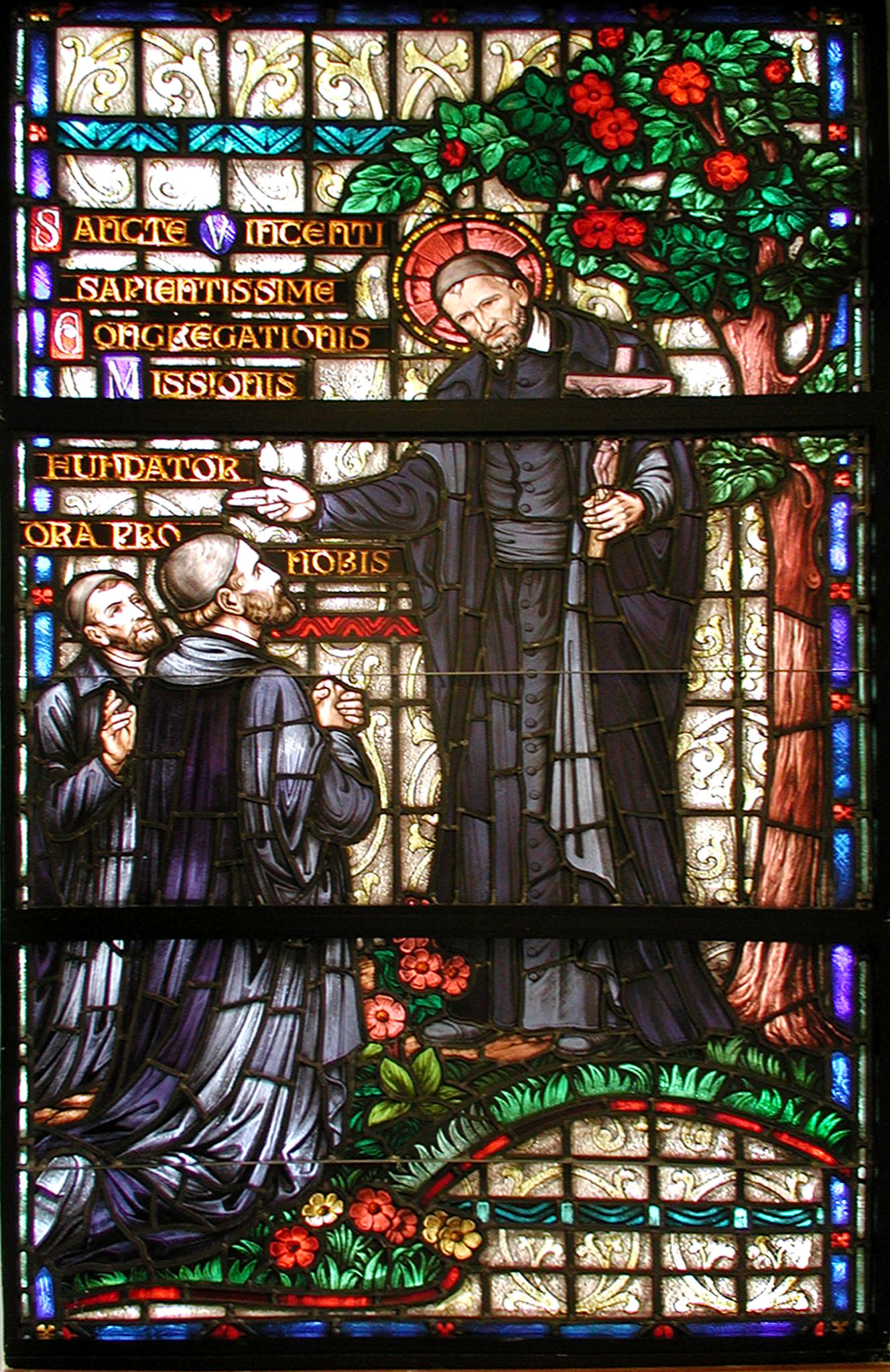 VdP , in cassock and mantle, holding crucifix, blesses two confreres. Text from litany: "SV, wise founder of the Congregation of the Mission, ..." Original in chapel, St. John's University, Jamaica, NY; transferred from earlier chapels
