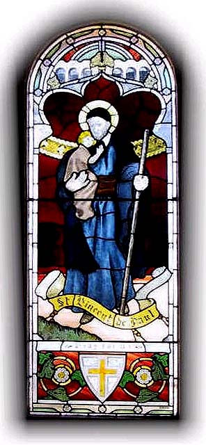 Vincent de Paul, in blue cassock, red cincture, dark cloak; holds infant, walking stick. Internet image. Original unknown.