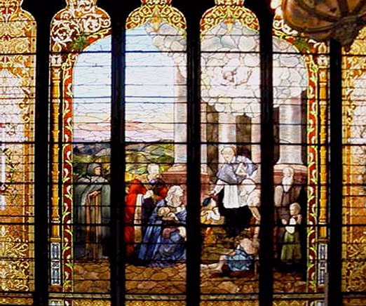 Vincent de Paul distributes charity to seven poor persons. Dressed as a canon, with violet cape. Internet image. Original in Detroit.