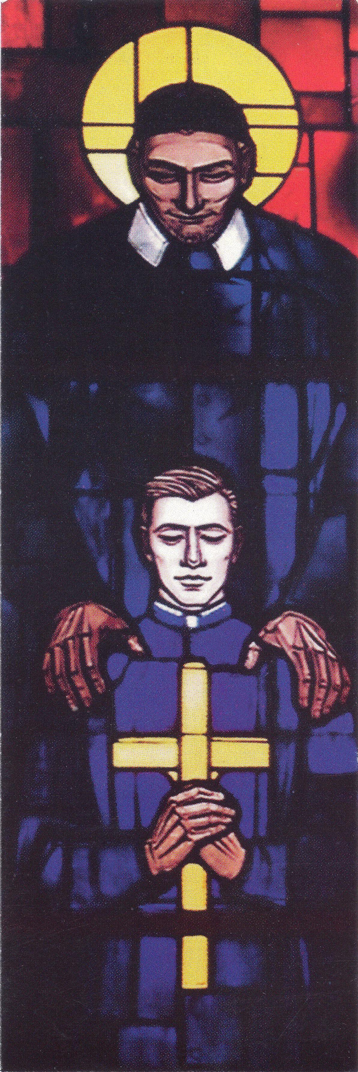 Vincent de Paul, standing, cassock, mantle, skullcap, halo; hands on shoulders of seminarian, holding cross; original in DePaul Center, Montebello, CA