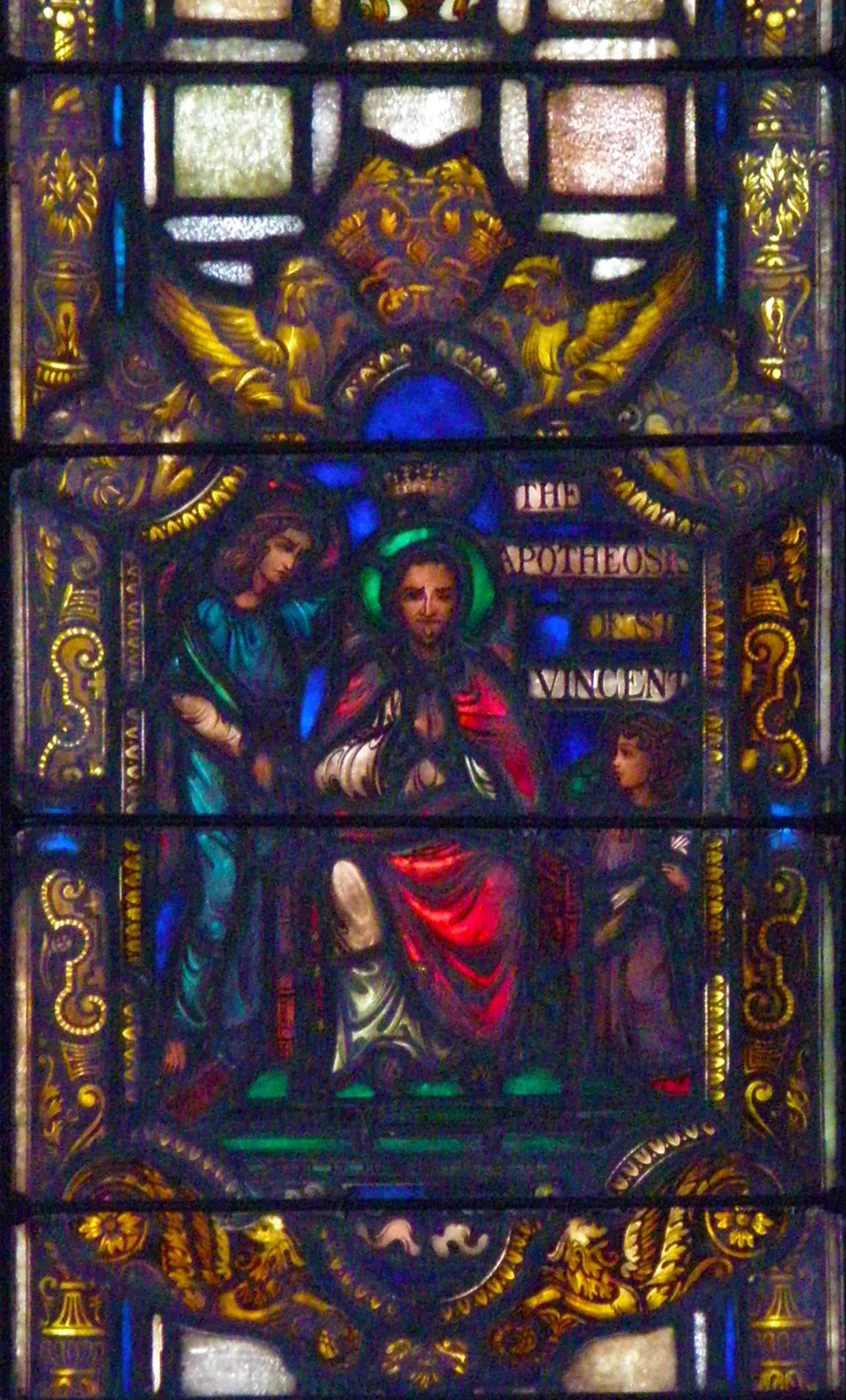 Vincent de Paul, seated on throne in royal robes, green halo, angel holding crown of victory, kneeling angel with musical instrument; St. Vincent de Paul church