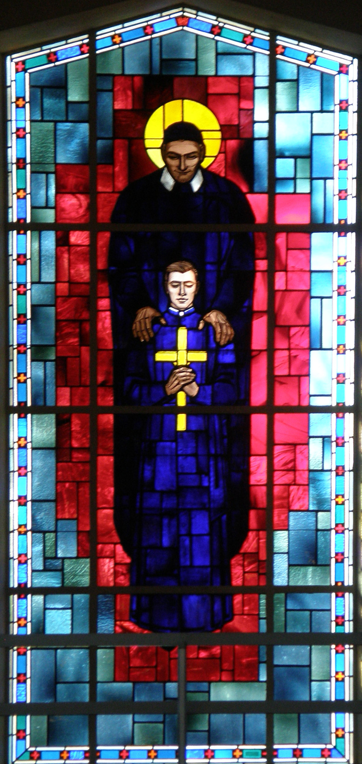 Vincent de Paul, standing, cassock, mantle, skullcap, gold halo; hands resting on shoulders of seminarian holding cross; in St. Vincent's, Montebello