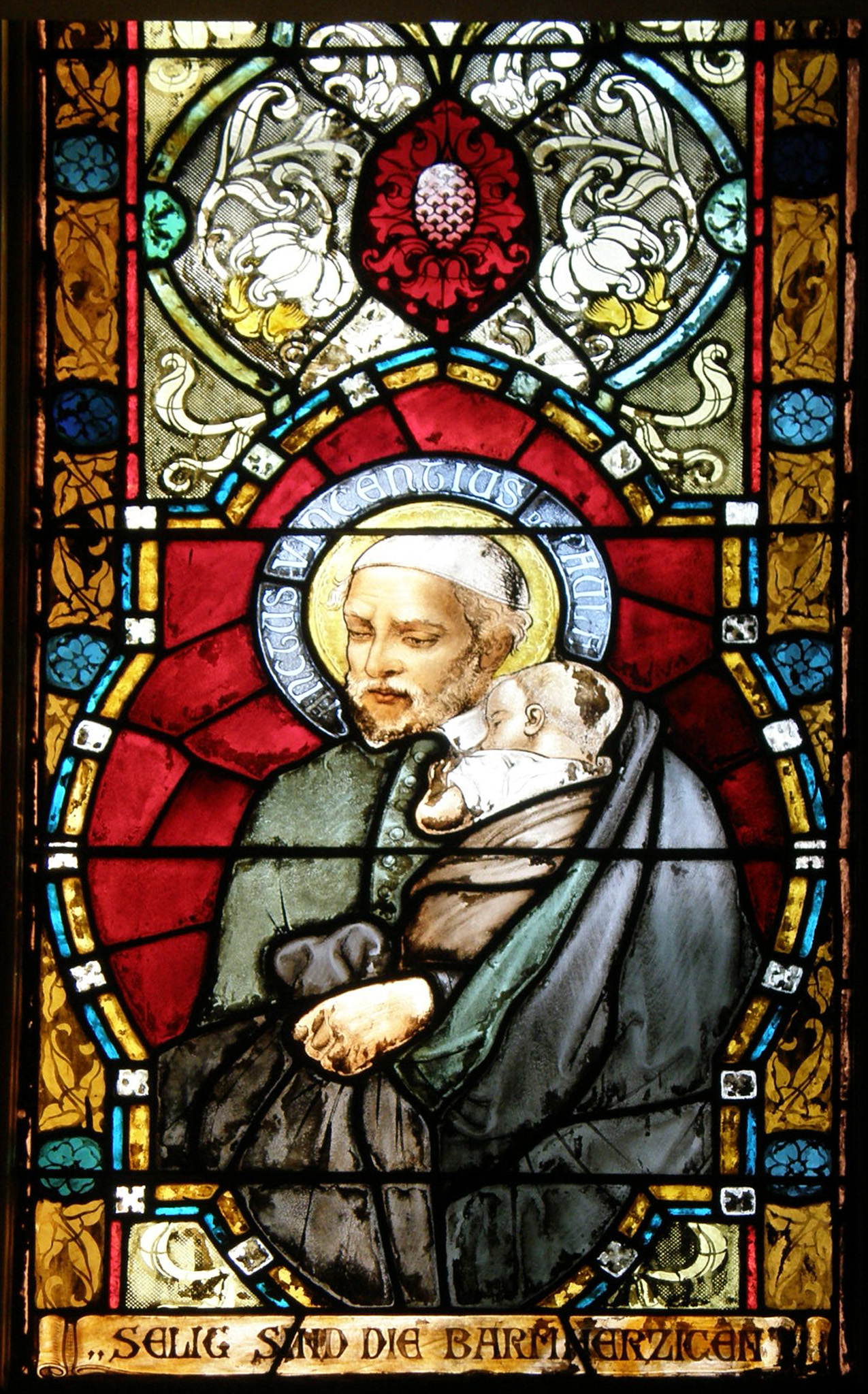 Vincent de Paul, holding sleeping child; cassock, cape, skullcap (significant color degradation); German text: Blessed are the merciful