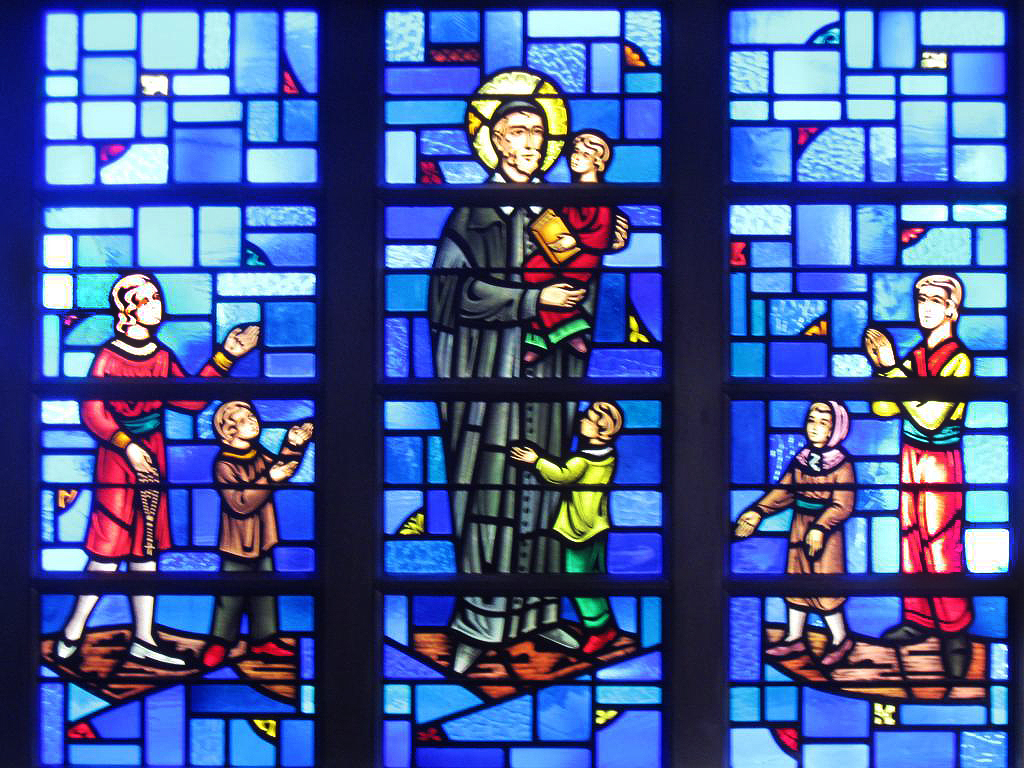 Vincent de Paul standing, cassock, mangle, skullcap, halo; six children; internet image