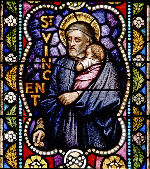 Vncent de Paul, standing, cassock, cape, skullcap, halo; holding coin in his hand, sleeping child in his arms; courtesy of Fr. Gene Plaisted, OSC