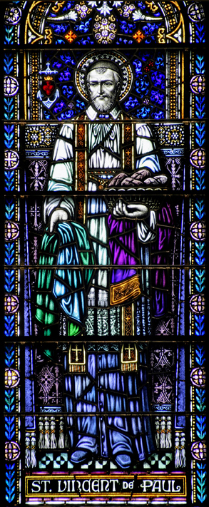 Vincent de Paul, standing, cassock, surplice, stole, skullcap, halo; holding bread, clothes; courtesy of Fr. Gene Plaisted, OSC
