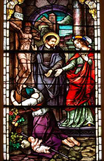 Vincent de Paul, caring for abandoned child, with Lady of Charity and praying mother