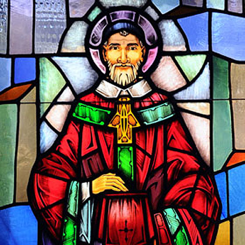 Vincent de Paul in Mass vestments, holding chalice covered with a veil and burse; internet image; at St. John's University, Staten Island campus
