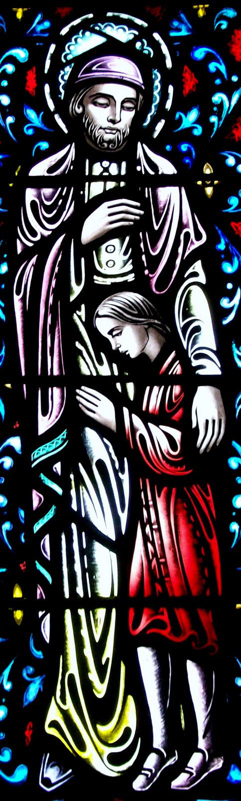 Vincent de Paul, standing, cassock, cape, cincture, skullcap, halo; St. Benedict's church; internet image