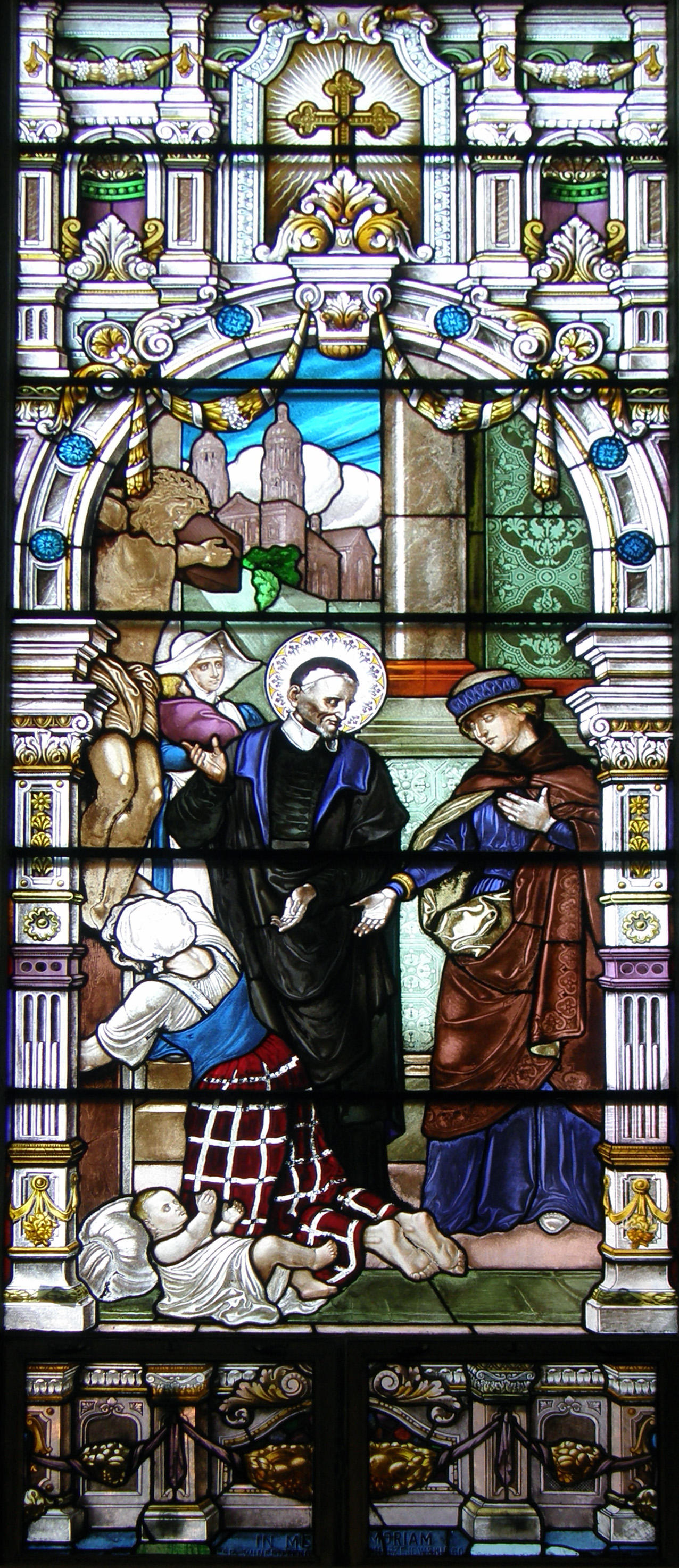 Based on German (?) painting; St. Hedwig church in upper left arch opening; Daughter of Charity; wealthy woman in contemporary hat