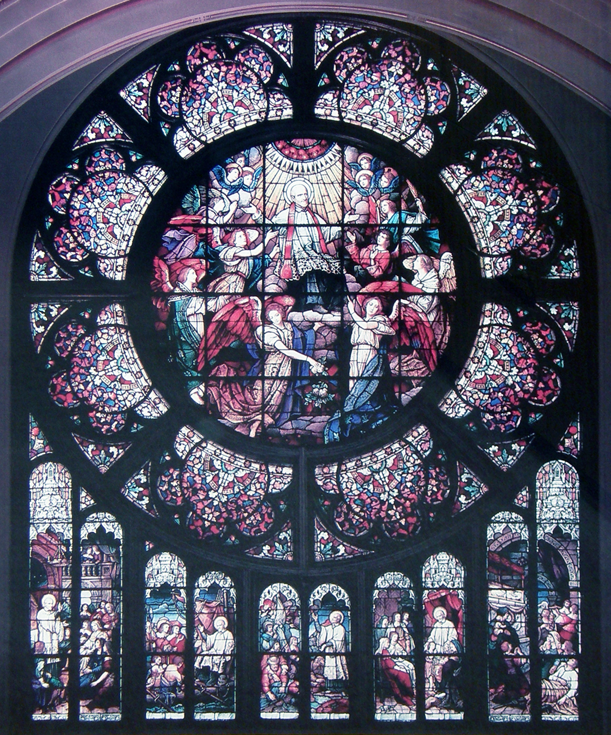 Lower 5 views based on beatification-canonization paintings; probably the world's largest stained glass window of St. Vincent (22' x 28'). Attributed to Mayer, Co., Munich; about 1896