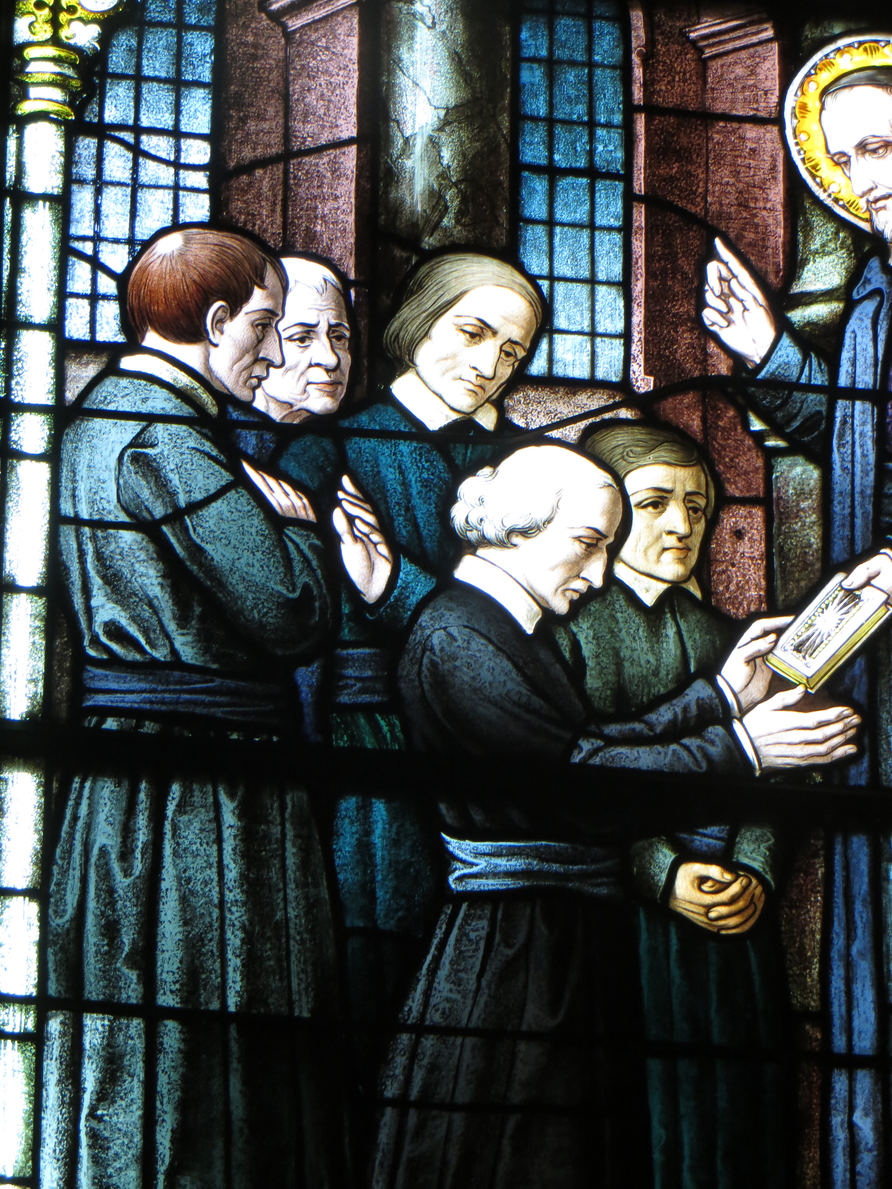 Window with portraits, unidentified; SVdP distributing Common Rules