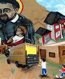 Vincent de Paul, with child; yellow truck gathering goods for Society of St. Vincent de Paul, El Paso; internet image