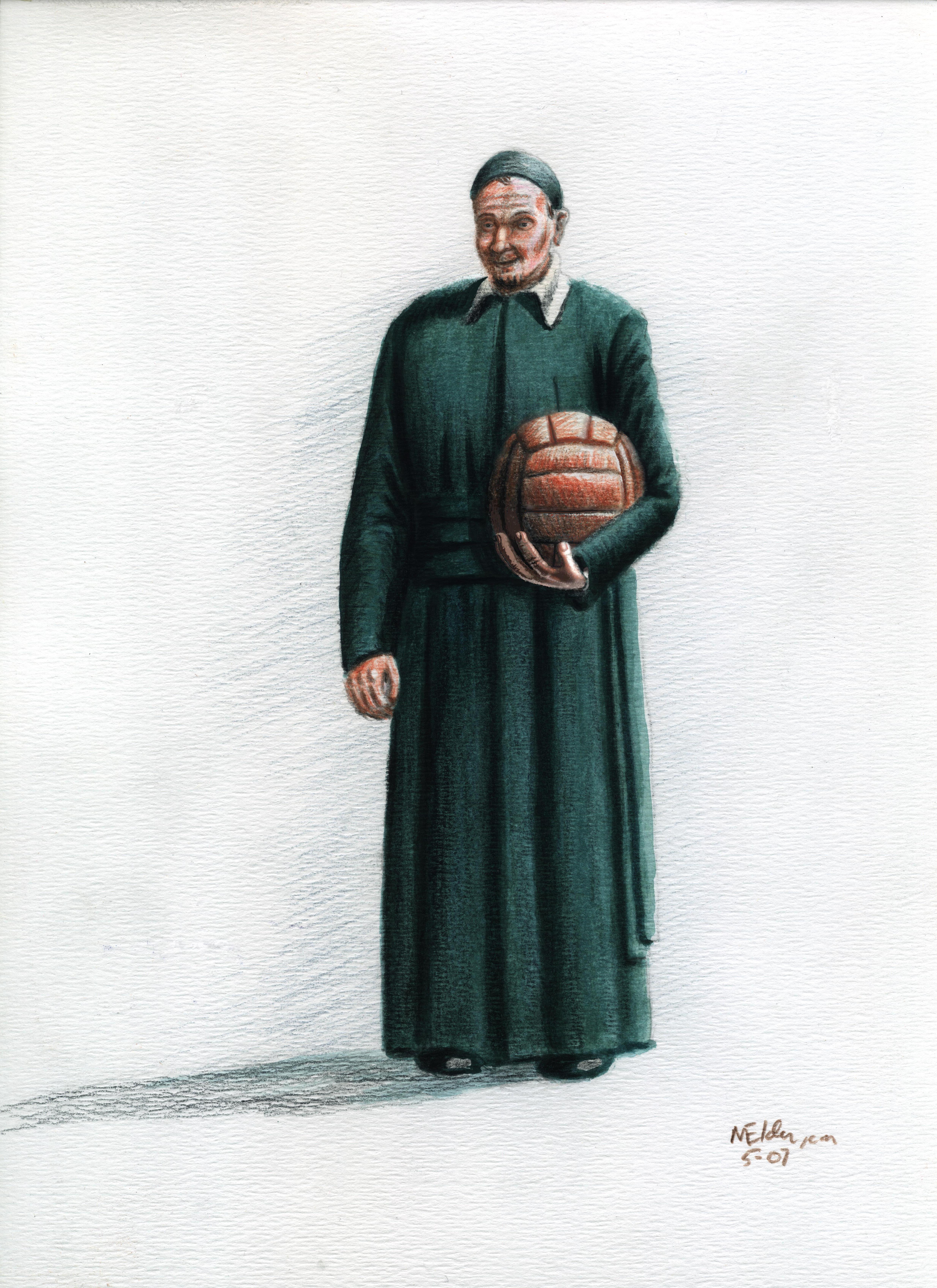 Drawing; Vincent de Paul, standing, cassock, cincture, skullcap, holding soccer ball; artist, Mark Elder, C.M., May 2007; original in Ireland