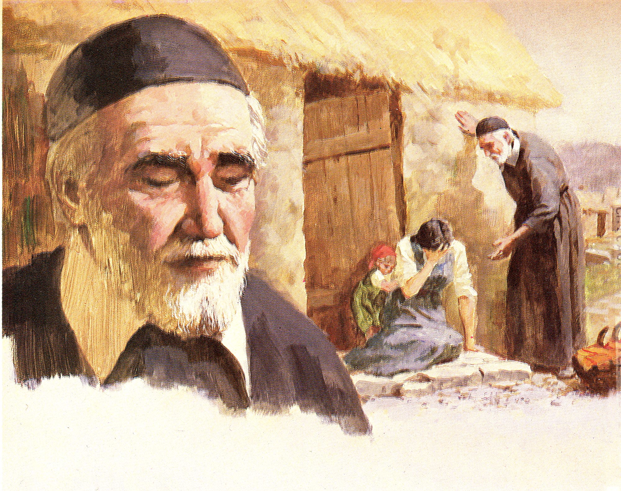 Vincent de Paul, shown twice, cassock, cincture, skullcap; woman with child outside thatch-roofed hut; original in Bro. Leo Keigher, CM, collection