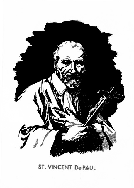 Vincent de Paul, cassock, surplice, stole, holding crucifix, hand on chest; original in Bro. Leo Keigher, CM, collection