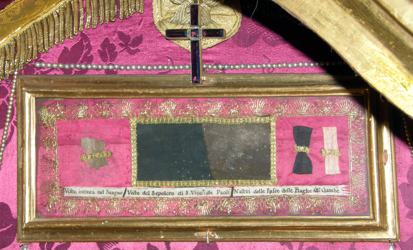 Left: garment marked with his blood; Center: clothing from original grave in St. Lazare chapel Right: bandages for wounds on his legs