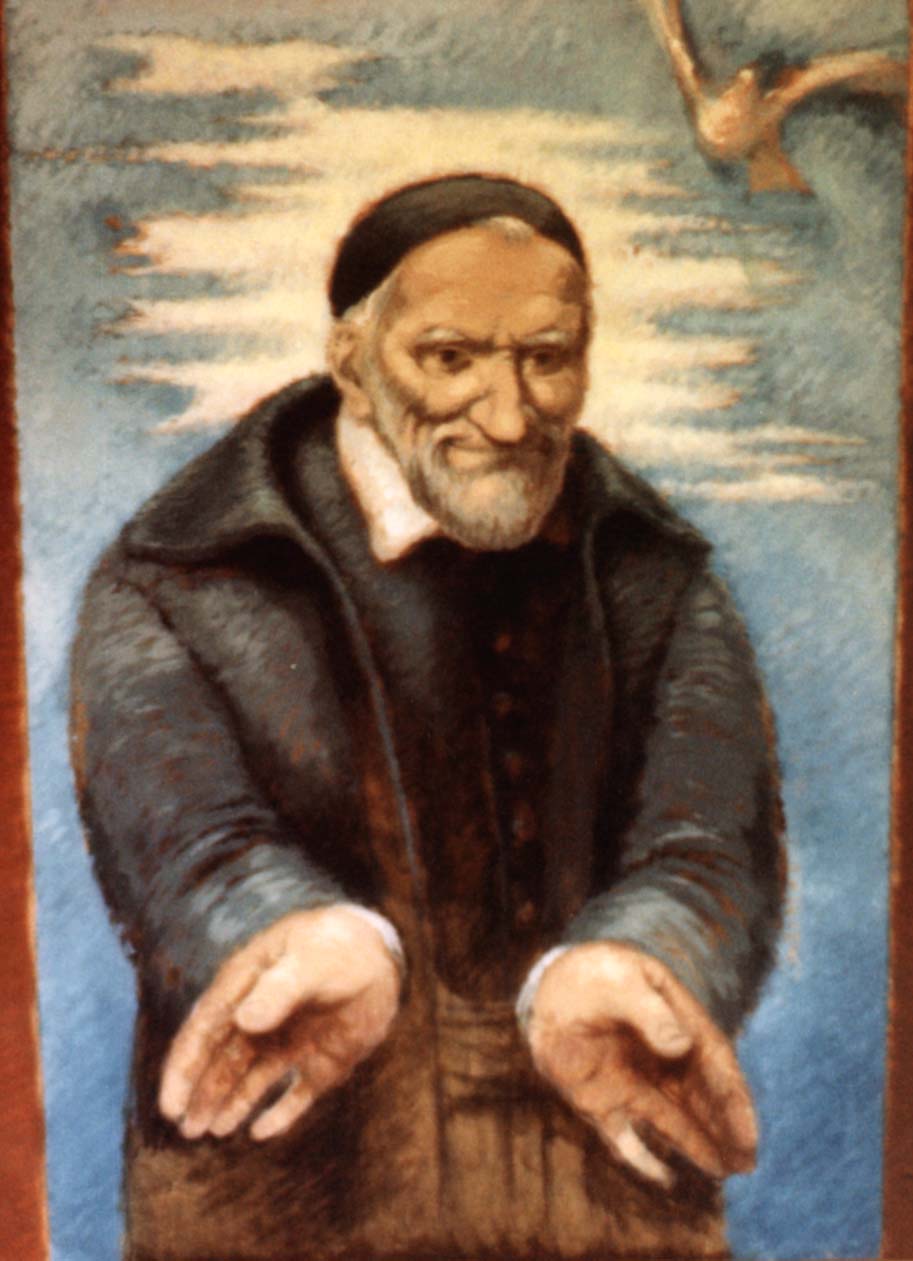 Oil painting, Vincent de Paul, cassock, mantle, with large hands; dove of Holy Spirit above; location of original unknown, maybe USA; based on painting by Falucci in Clichy