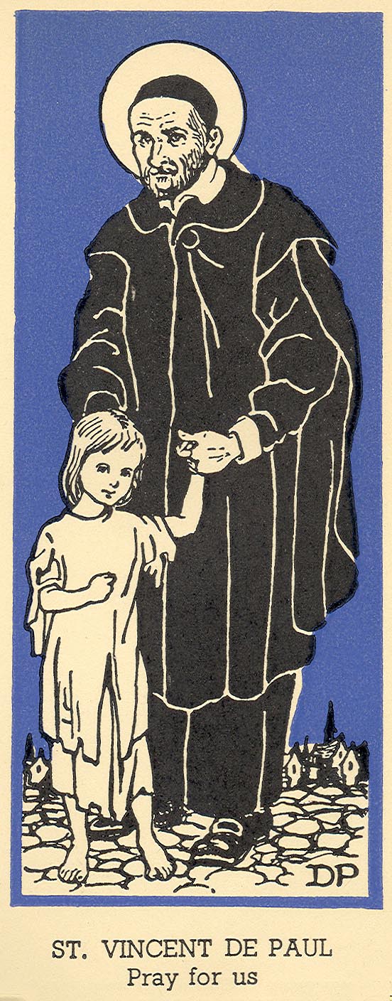 Vincent de Paul, standing, cassock, mantle, skullcap, halo, with poor girl, outdoors; signed DP; Original in Bro. Leo Keigher, CM, collection