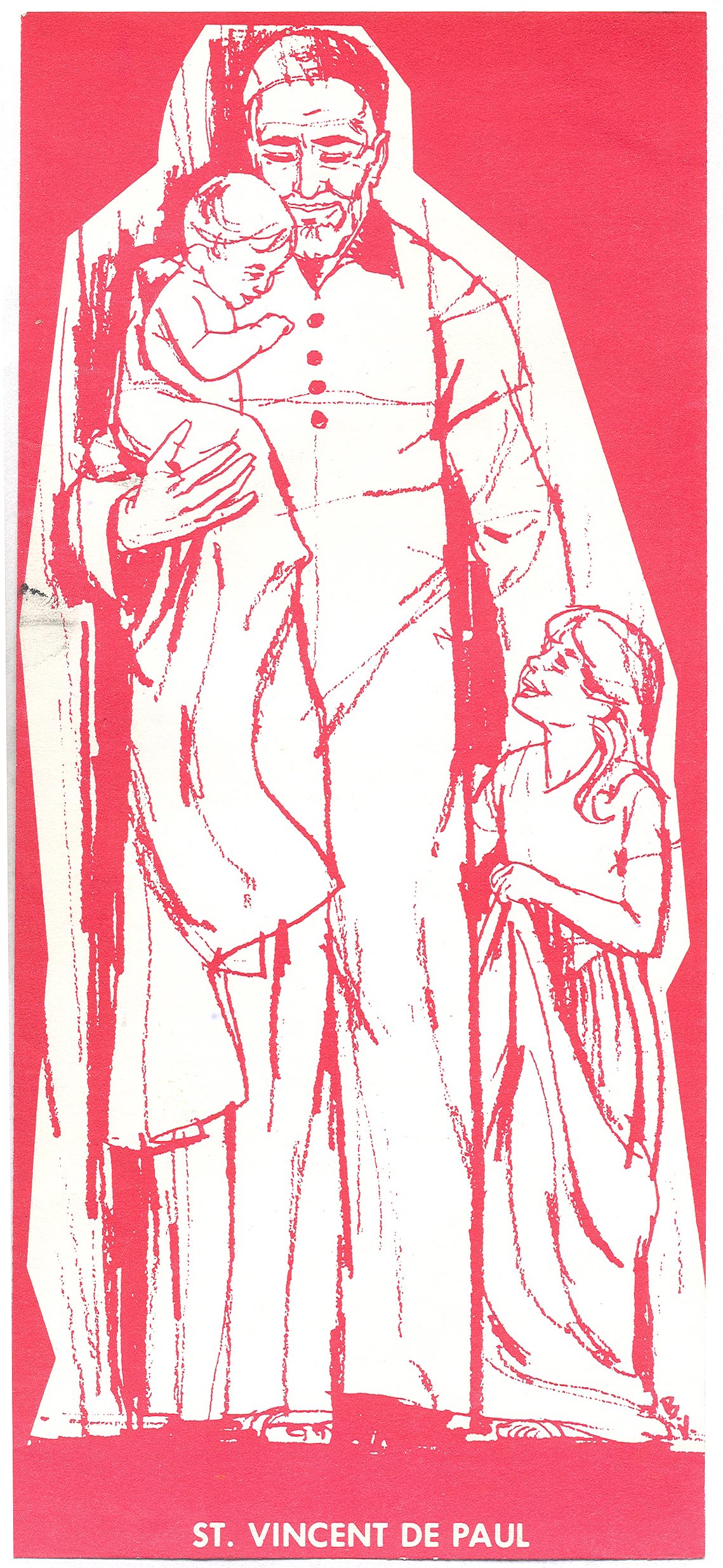 Vincent de Paul, standing, cassock, 4 buttons, mantle, smiling girl, red background; original in Bro. Leo Keigher, CM, collection