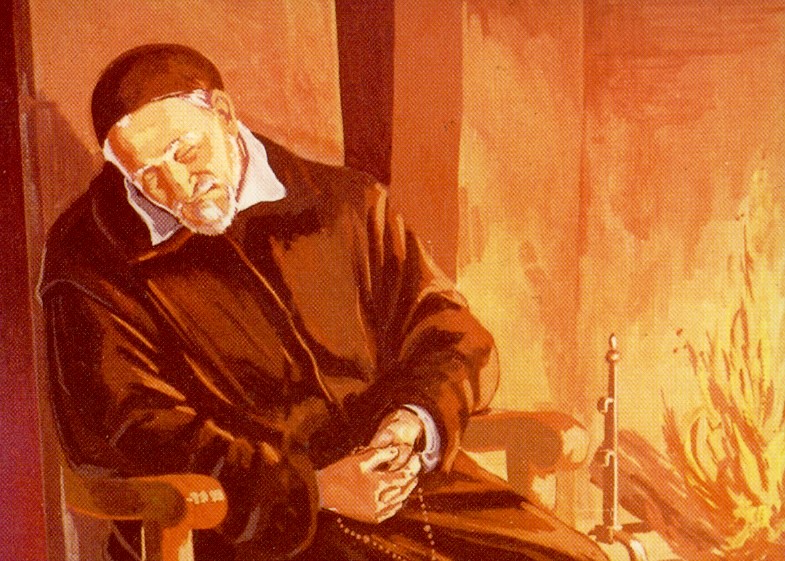 Vincent de Paul, seated, cassock, mantle, skullcap, holding rosary; in armchair, sleeping by a fire; location of original unknown