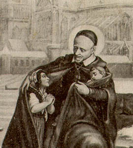 Vincent de Paul and two foundlings, by Notre Dame of Paris