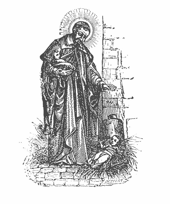 Book illustration (?); Vincent de Paul, standing, cassock, mantle, skullcap, halo; finding abandoned child in hay; child in his arms