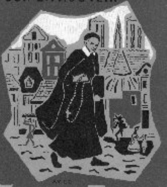 Book illustration (probably cover); Vincent de Paul, with rosary, book or portfolio in hand; street scenes of Paris