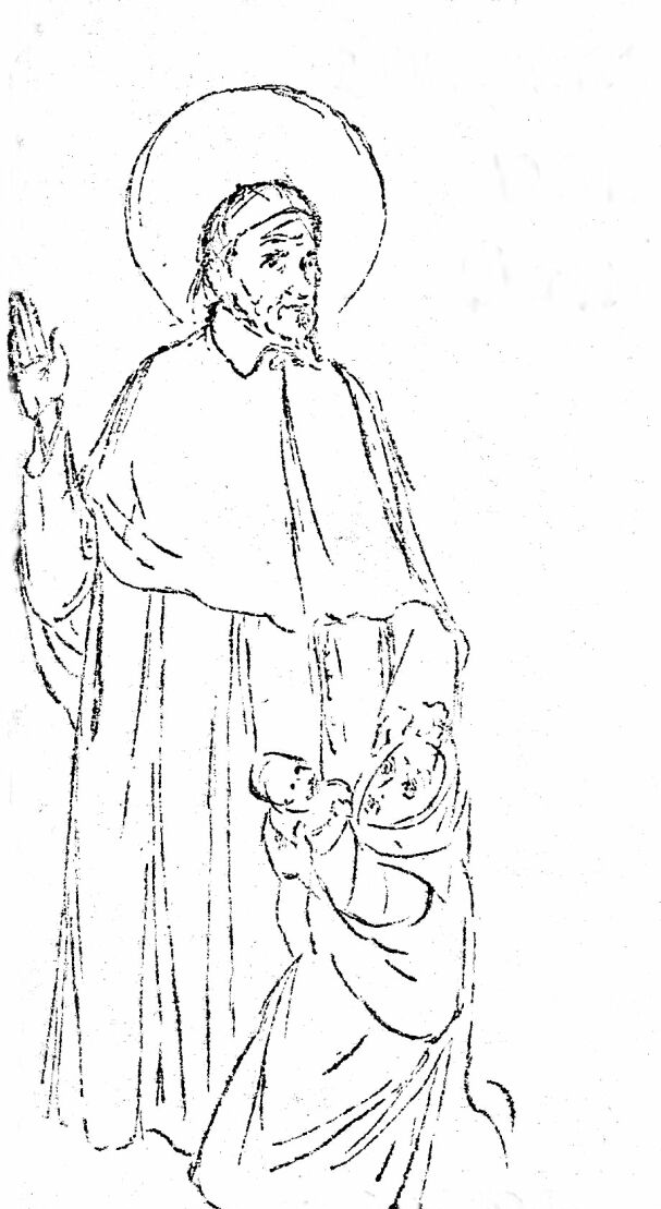 Pen drawing; Vincent de Paul, standing, short cape, skullcap, halo; woman kneeling at his feet, holding child