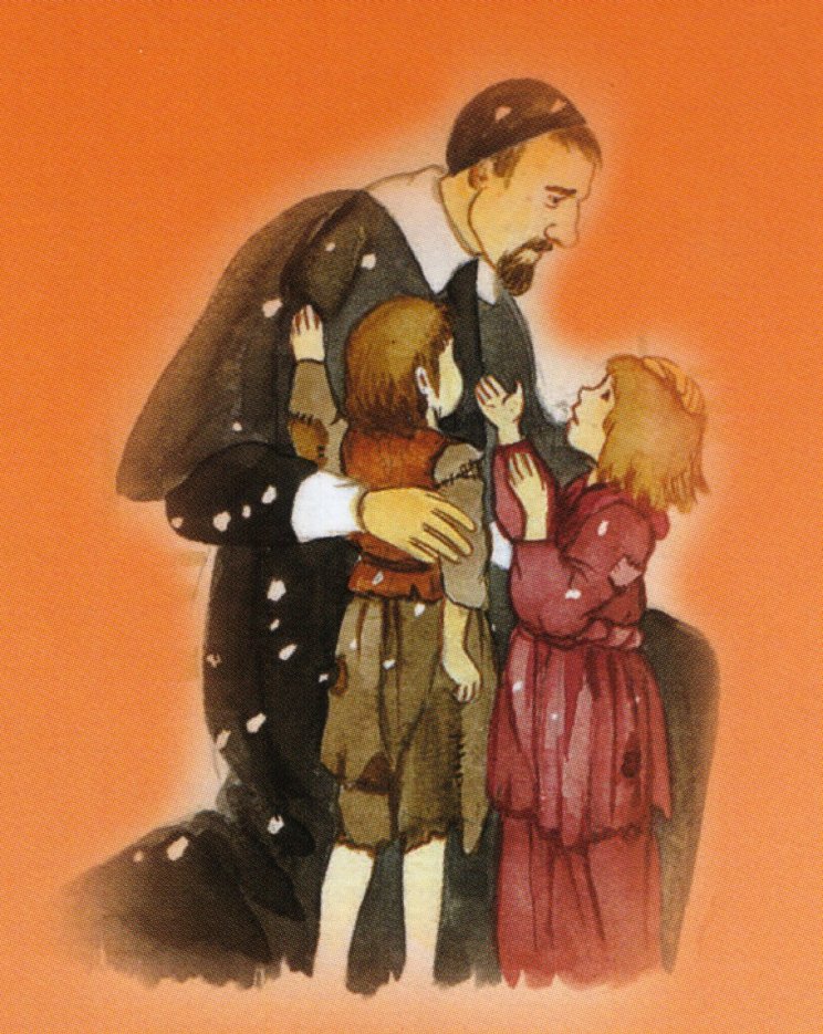 Vincent de Paul, kneeling on one knee, cassock, short cape, skullcap, with two children in patched clothes, possibly in falling snow; location of original unknown