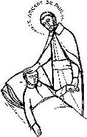 Vincent de Paul, standing, cassock, cincture, cape, skullcap; consoles sick boy in bed