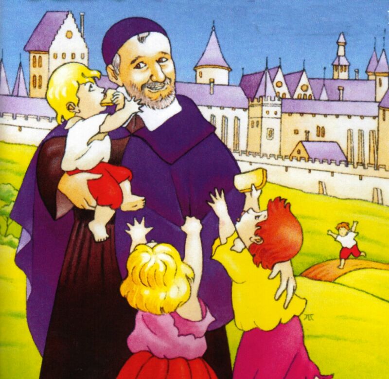 Vincent de Paul, standing, cassock, cape, skullcap, with three children, another in background outside city walls; location of original unknown
