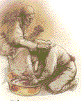 Vincent de Paul, seated, cassock, skullcap, has his feet washed; internet image