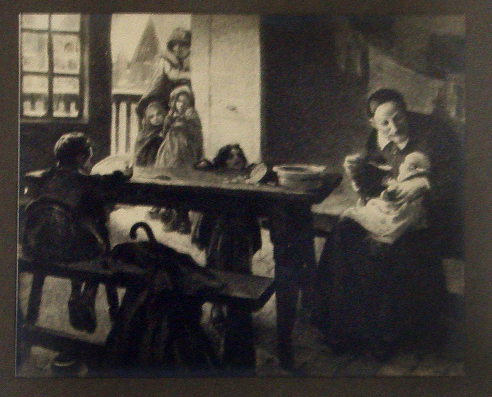 Vincent de Paul, seated in cassock, skullcap, feeding a child; others at table in room, woman outside with two children; work of Georges-Pierre Dutriac