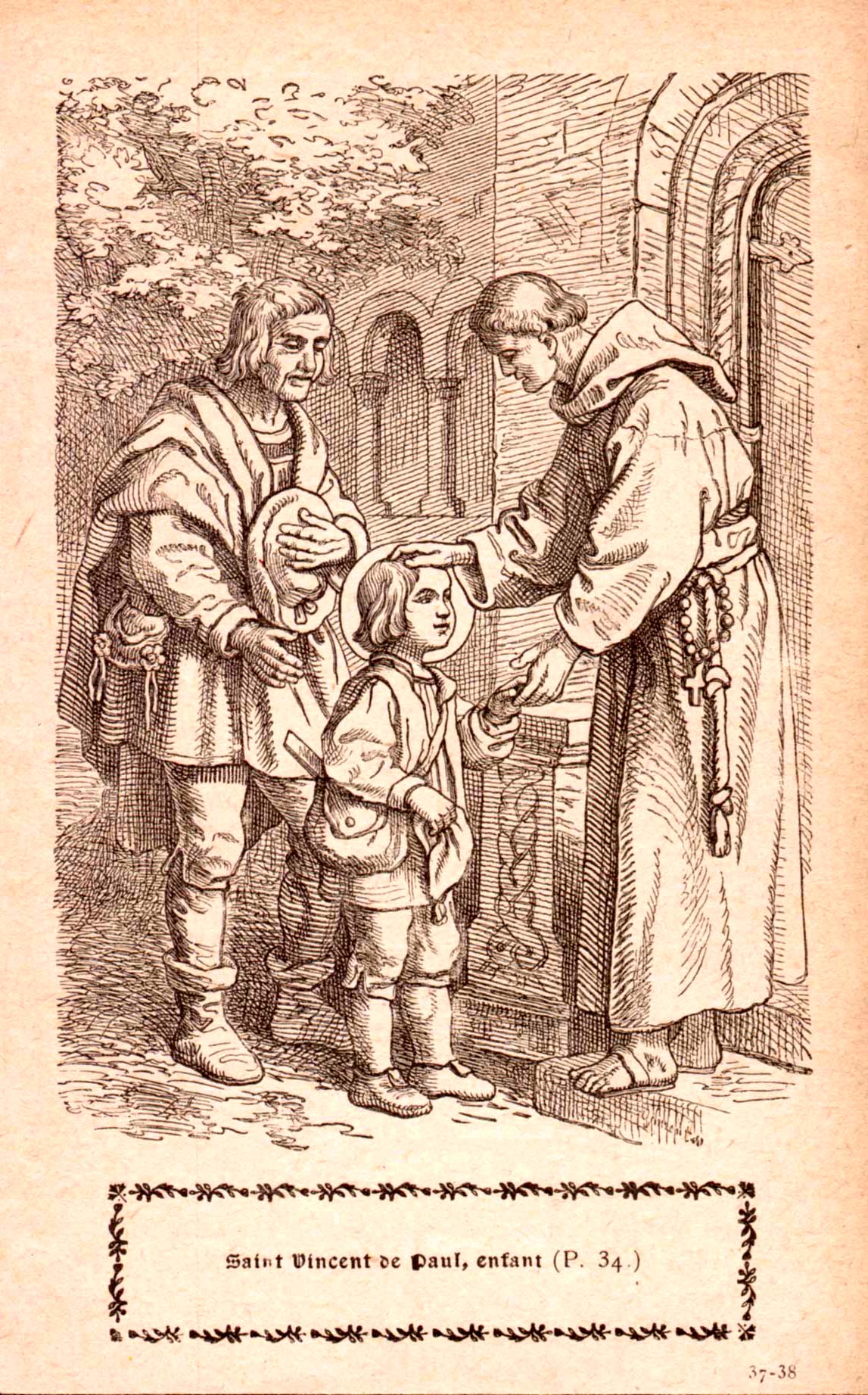 Book illustration; Vincent de Paul as boy, with halo; father behind; confided to Franciscan at Dax for early education