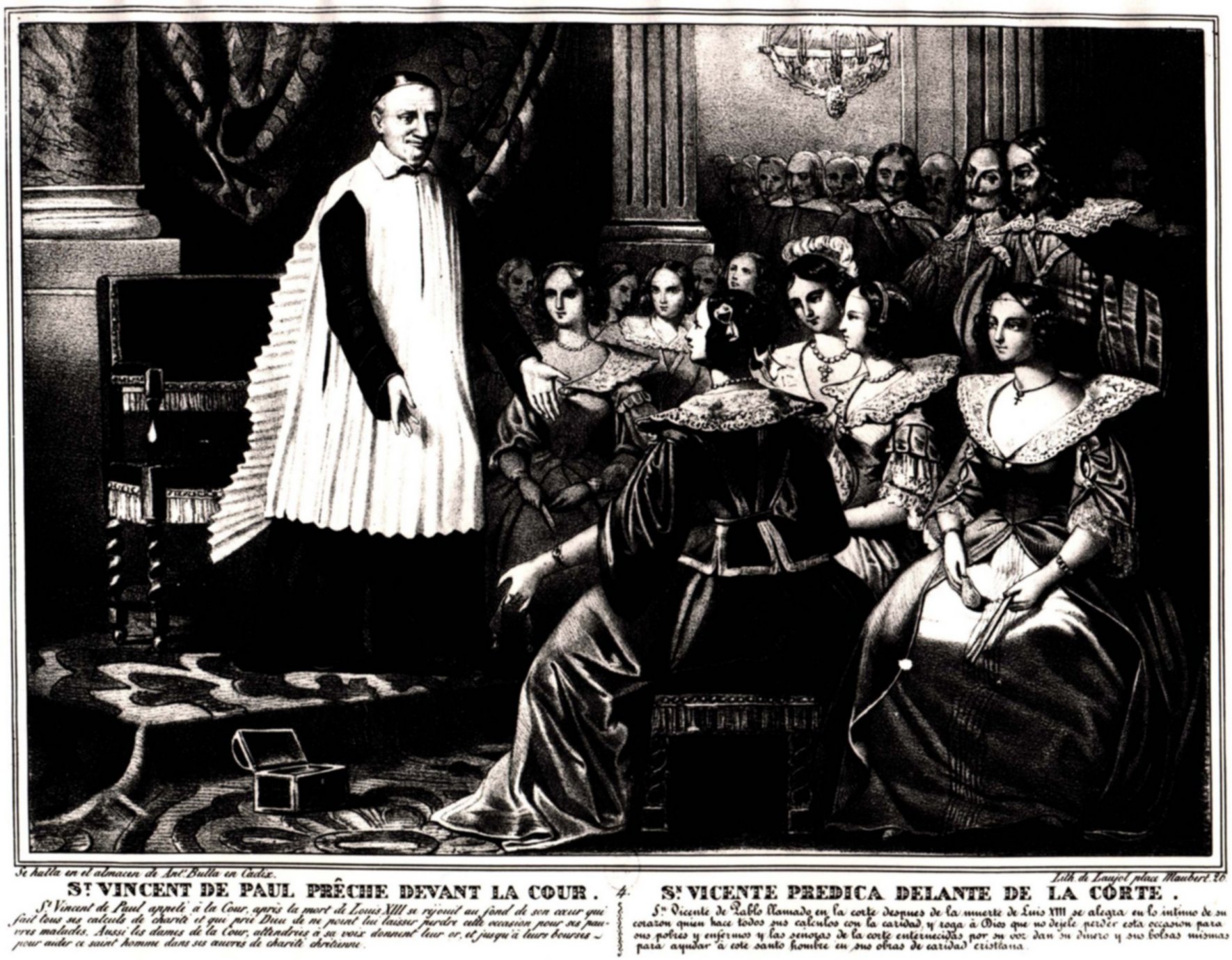 Engraving; Vincent de Paul, standing, cassock, Parisian surplice, skullcap; preaching before the Court; text in French and Spanish