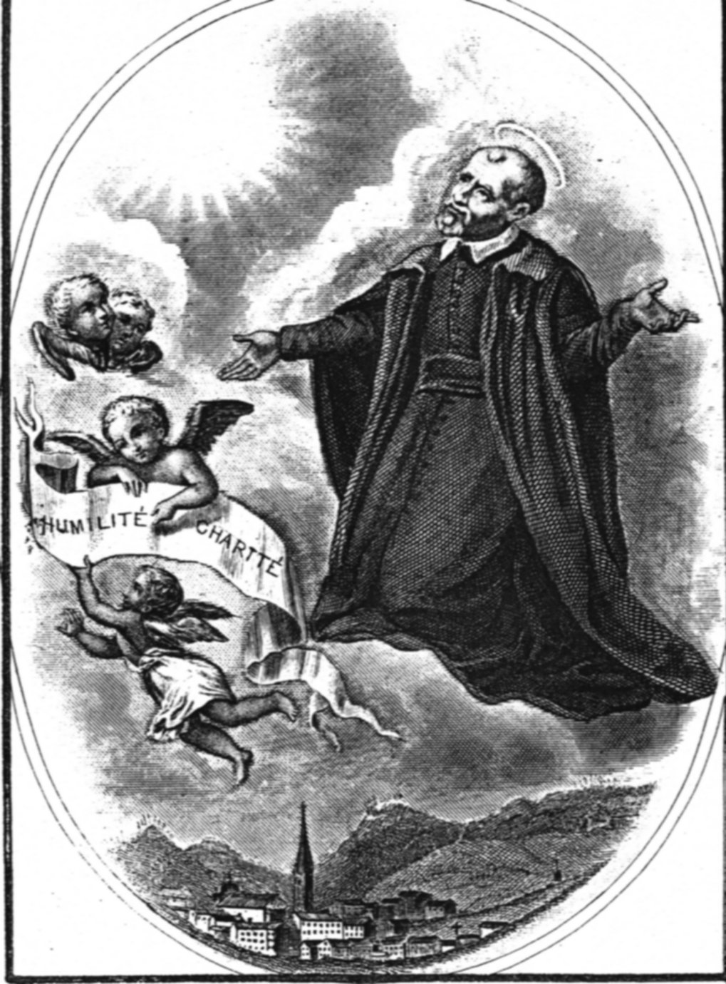 Book illustration (?); Vincent de Paul, kneeling on clouds, cassock, mantle, cincture, halo; angels with Humility, Charity ribbon; based on canonization painting
