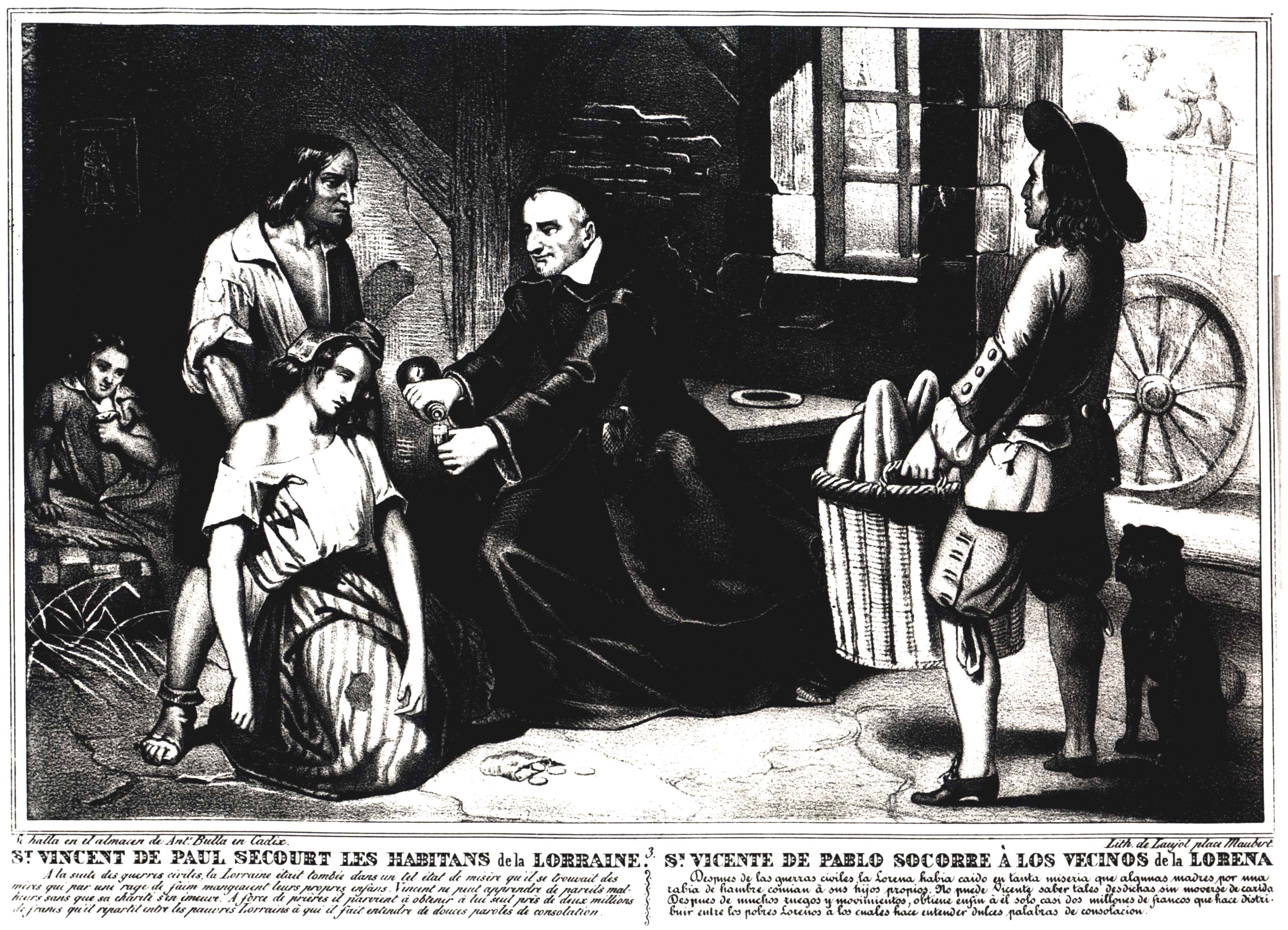 Engraving, Vincent de Paul, cassock, mantle, skullcap, pouring liquid into a glass for poor woman in Lorraine; basket of bread, cart and dog; text in French and Spanish